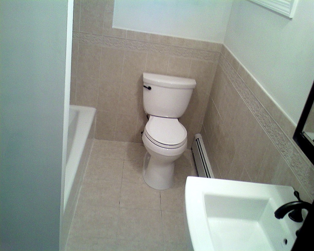 Vanity, toilet and tile floor installation.